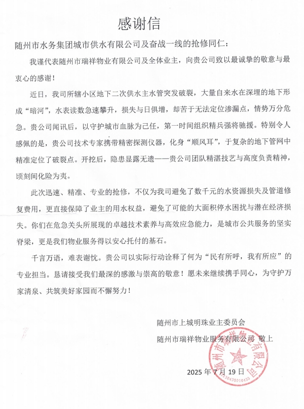 7月19日,上城明珠小區(qū)業(yè)委會(huì)與瑞祥物業(yè)的代表滿懷感激,將一面繡有“排憂解難、水域神探” 的錦旗和一封情真意切的感謝信送到城市供水公司,以此表達(dá)全體業(yè)主對(duì)城市供水公司的誠(chéng)摯謝意。“若不是有你們團(tuán)隊(duì)的精湛技藝與高度負(fù)責(zé)精神,我們的損失不堪設(shè)想!這面錦旗雖輕,卻裝著全體業(yè)主的滿心感激!” 代表們緊握工作人員的手,話語間滿是動(dòng)容。
