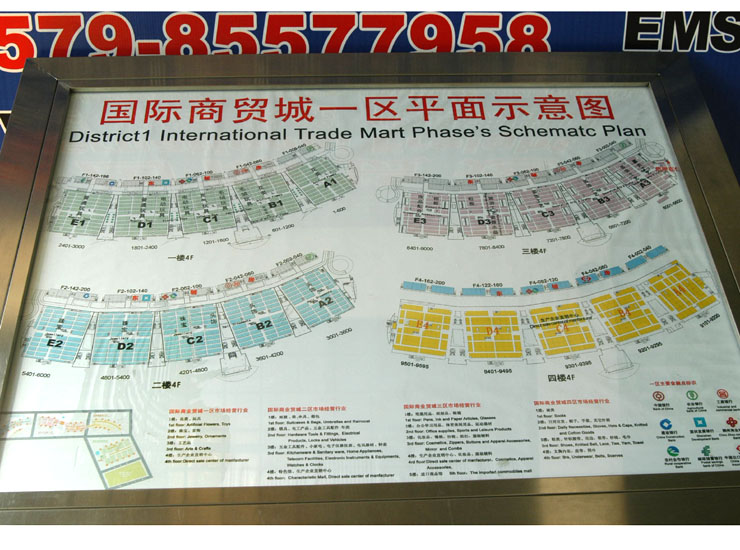 中國義烏國際商貿(mào)城一區(qū)市場于2001年10月奠基,2002年10月22日正式投入營運,市場占地420畝,建筑面積34萬平方米,總投資7億元,分為主體市場、生產(chǎn)企業(yè)直銷中心、商品采購中心、倉儲中心、餐飲中心五大經(jīng)營區(qū),共有商位10000余個,經(jīng)營戶10500余戶。一樓經(jīng)營花類、玩具;二樓經(jīng)營飾品;三樓經(jīng)營工藝禮品;四樓開辦了中小生產(chǎn)企業(yè)直銷中心、臺商館,東輔房為外貿(mào)企業(yè)采購服務(wù)中心。 國際商貿(mào)城是一個集現(xiàn)代化、國際化、信息化于一體的商品交易市場。自開業(yè)以來,一是實現(xiàn)了由傳統(tǒng)貿(mào)易向以商品展示、洽談、接單和電子商務(wù)為主的現(xiàn)代化經(jīng)營方式的轉(zhuǎn)變,被國內(nèi)外客商譽(yù)為“永不落幕的博覽會“;二是實現(xiàn)了國際貿(mào)易超過國內(nèi)貿(mào)易的轉(zhuǎn)變,每天客商達(dá)4萬人次,外商達(dá)5000人次,商品外貿(mào)出口率達(dá)60%以上,90%以上商位承接外貿(mào)業(yè)務(wù),商品銷往140多個國家和地區(qū);三是實現(xiàn)了市場硬件的智能化,整個市場人流、物流、信息流暢通,場內(nèi)安裝電梯、自動扶梯37座,汽車可直上二、三、四層,整個市場安裝了13000多個寬帶網(wǎng)絡(luò)接口,每個商位都可上網(wǎng)交易和查閱信息。
